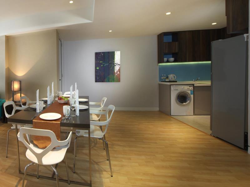 The 2-bedroom Suite is luxuriously designed to bring comfort and a sense of home to both business and leisure travelers. Each suite provides 119 sqm of comfort and spacious living, separate bedrooms with king or twin-sharing single size bed and study room. Each unit is also comes with a fully equipped kitchenette, in-room washer and dryer, LCD satellite TV that caters to daily needs.