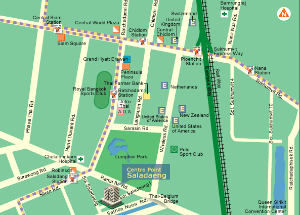 The location of Centre Point Saladaeng Bangkok in Bangkok is at a very convenient position. The location of Centre Point Saladaeng Bangkok in Bangkok is in Soi Saladaeng 1. This place is near the junction of Bangkok's premier business roads such as Rama IV, Sathorn and Silom. Railway stations like Sala Daeng Skytrain Station and Silom MRT Station are at a five minutes walking distance from the Centre Point Saladaeng Bangkok in Bangkok. The loacation of Centre Point Saladaeng Bangkok in Bangkok gives the tourists ample chance to get to almost any place in central Bangkok. The Silom Subway station and Saladaeng Skytrain station make the nearby interesting places all the more easily accessible.